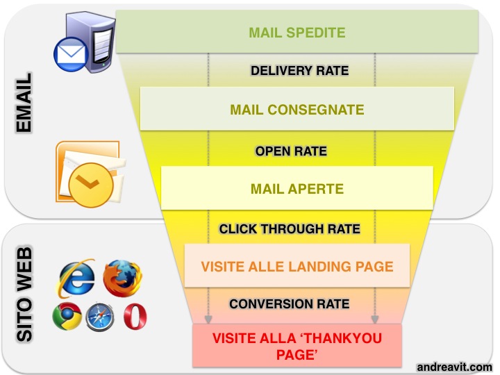 Lo schema qui a fianco rappresenta un classico Conversion funnel che mostra i diversi passi necessari per passare dalla semplice mail spedita all'effettiva azione di conversione.