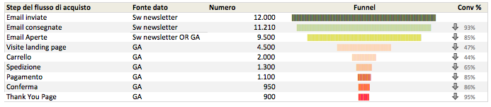Attraverso l'incrocio dei dati del software di mail marketing e Google Analytics, è possibile la costruzione di funnel di questo tipo (la costruzione un po' artigianale è proposta in questo post, a me tutto sommato non dispiace :-) ):